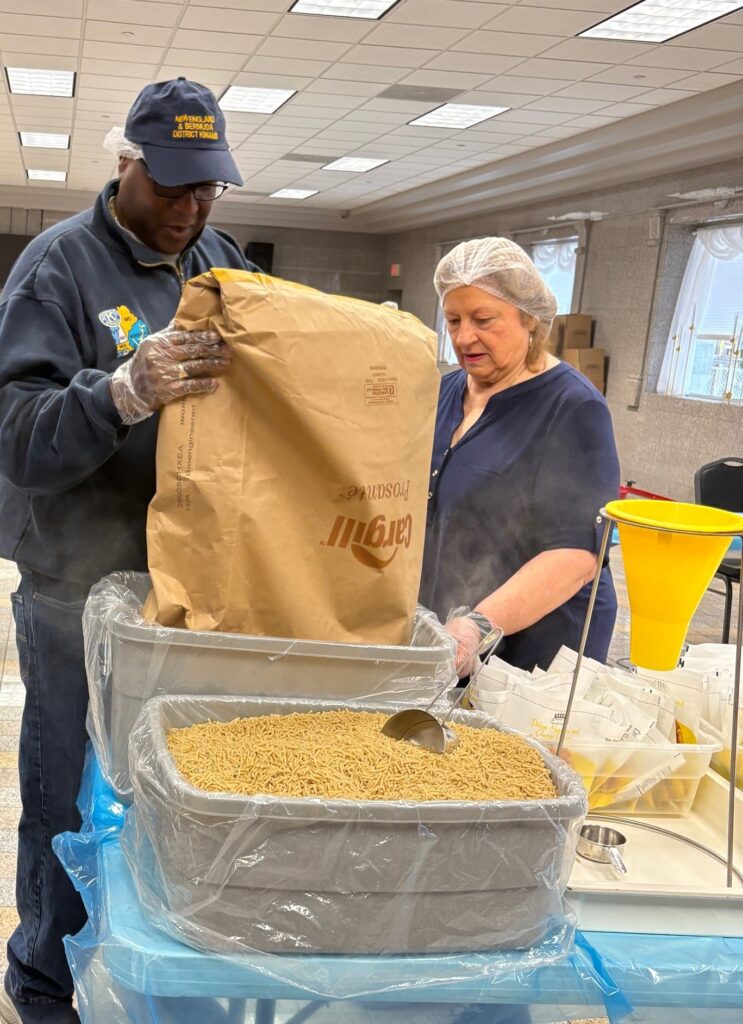 Our table of Greater Enfield Kiwanians packed over 2,000 meals in one morning!Club member, Motkue, loads up the protein for meal packing while club member, Nancy, makes sure it all goes in the bin.